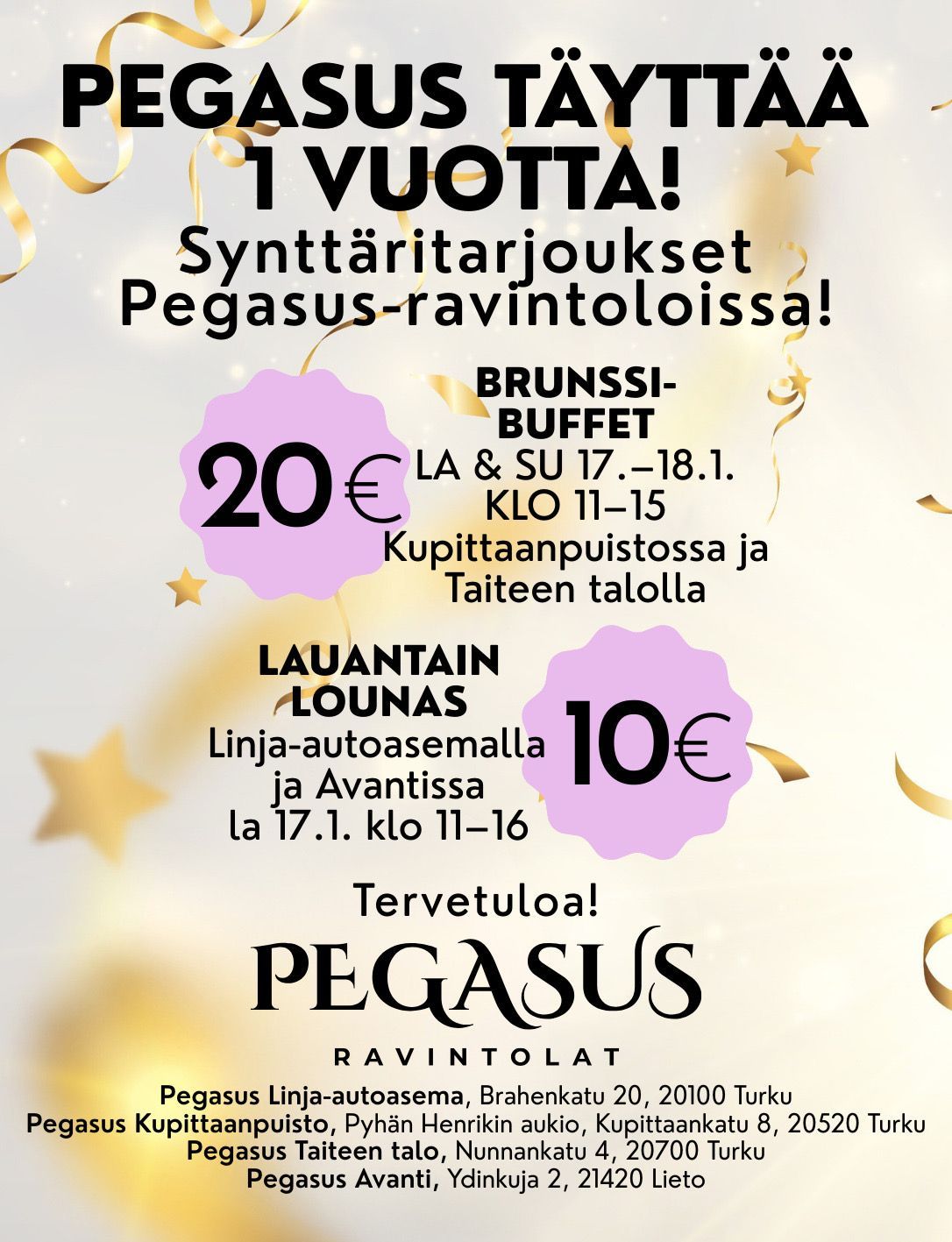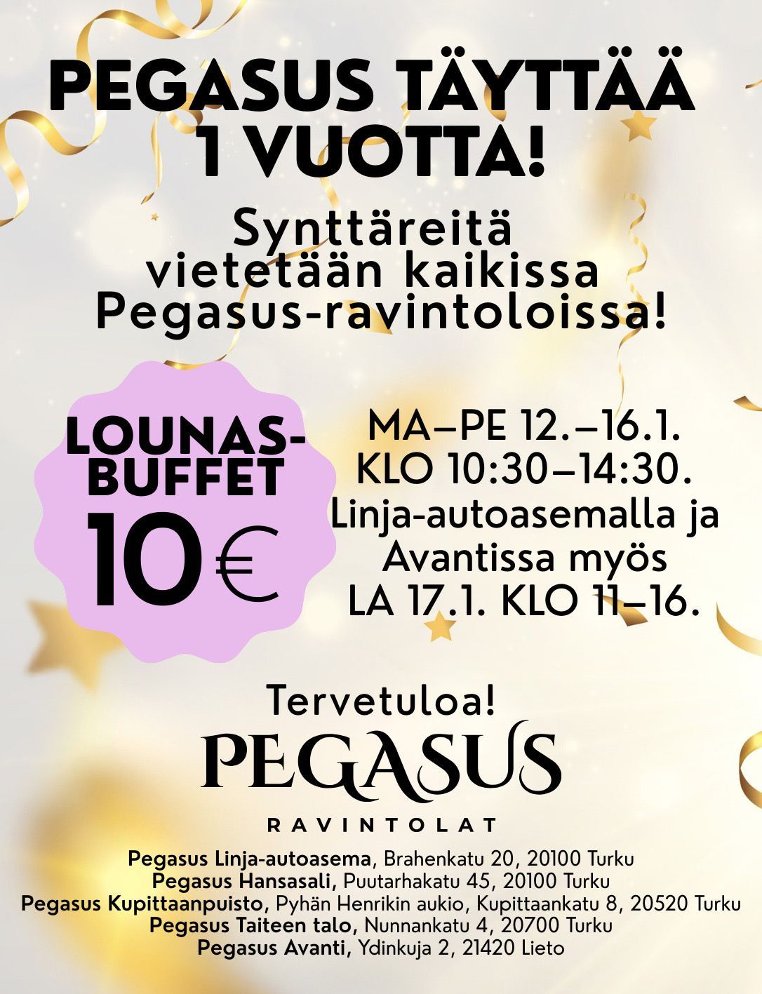 PEGASUS RAVINTOLOIDEN 1V SYNTTÄRIT 12.-18.1.2026!