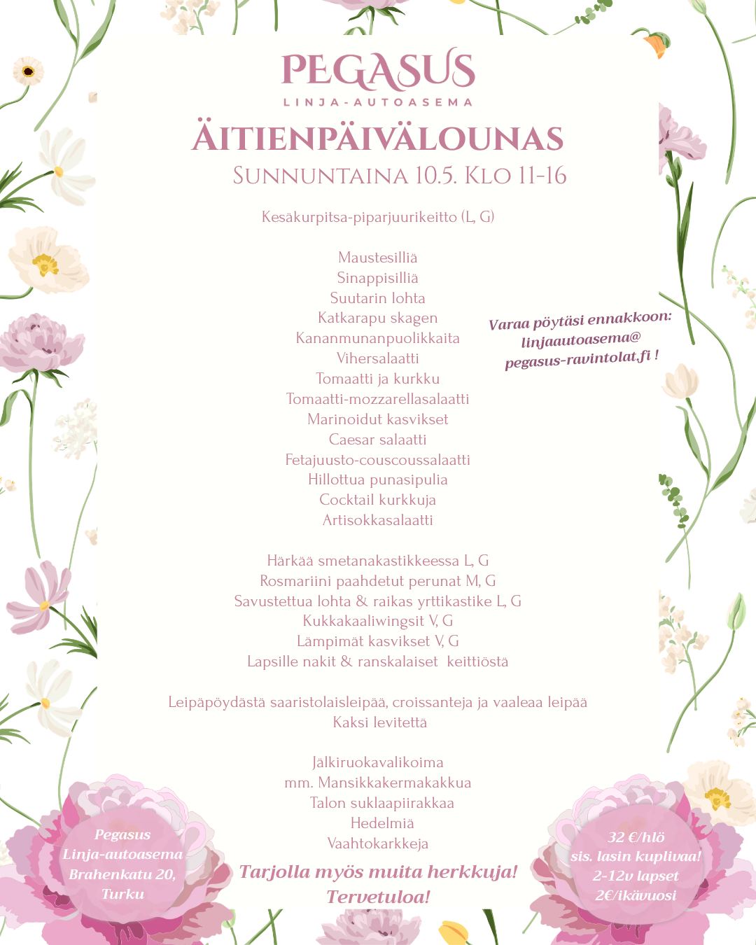 Pegasus Linja-autoasema tarjoaa lounasta joka arkipäivä klo 10.30-14.30 sekä lauantaisin klo 11-15. Myymme myös take away -ruokaa! Järjestämme lisäksi mielenkiintoisia tapahtumia ja keikkoja, ja tarvittaessa löydät meiltä myös kabinettitilat kokous- ja juhlakäyttöön. Palvelemme aivan Turun keskustan liepeillä.