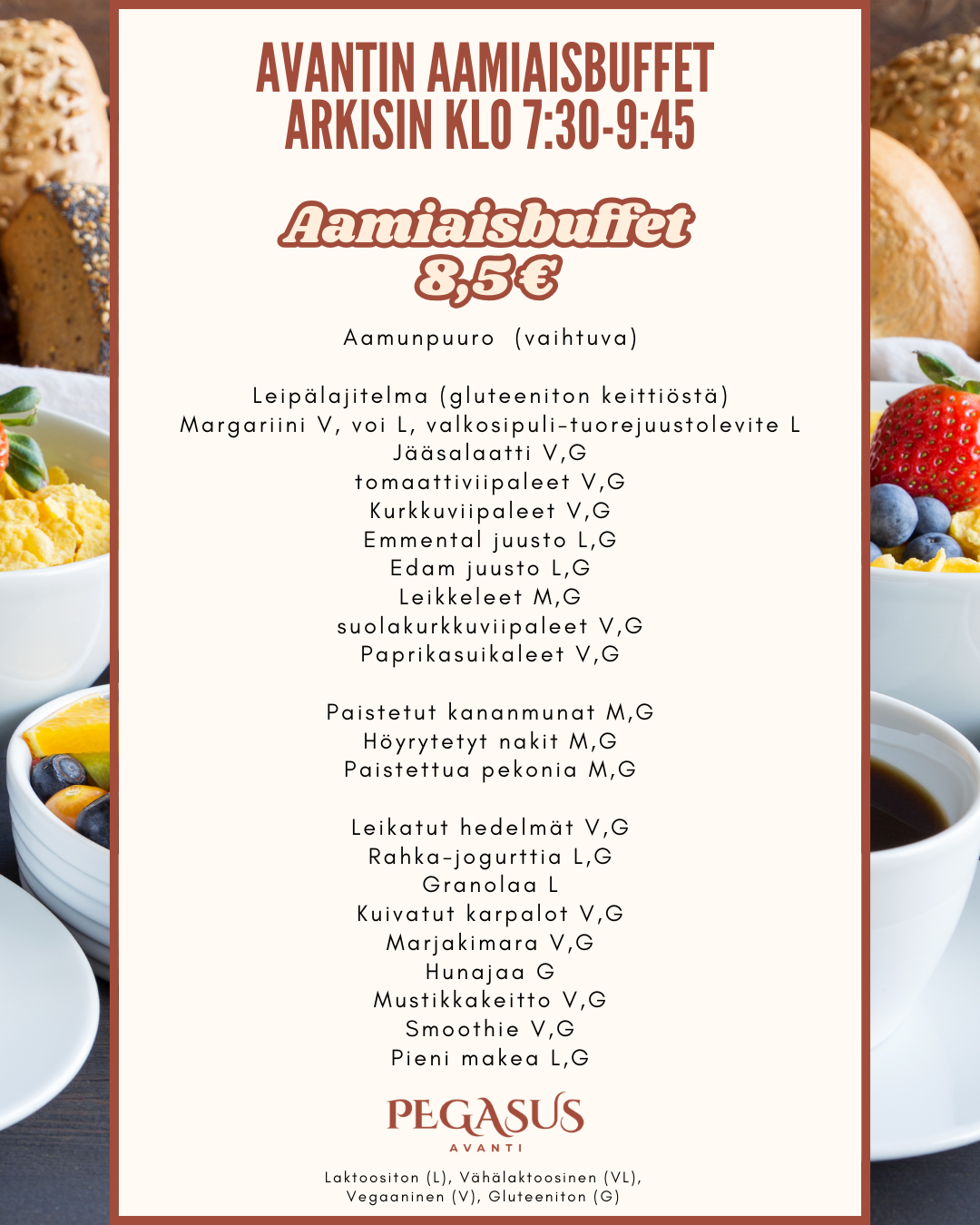 Tarjolla on arkisin Avantin oma aamiaisbuffet klo 7.30-9.45 sekä herkullista lounasta klo 10.30-14.30.