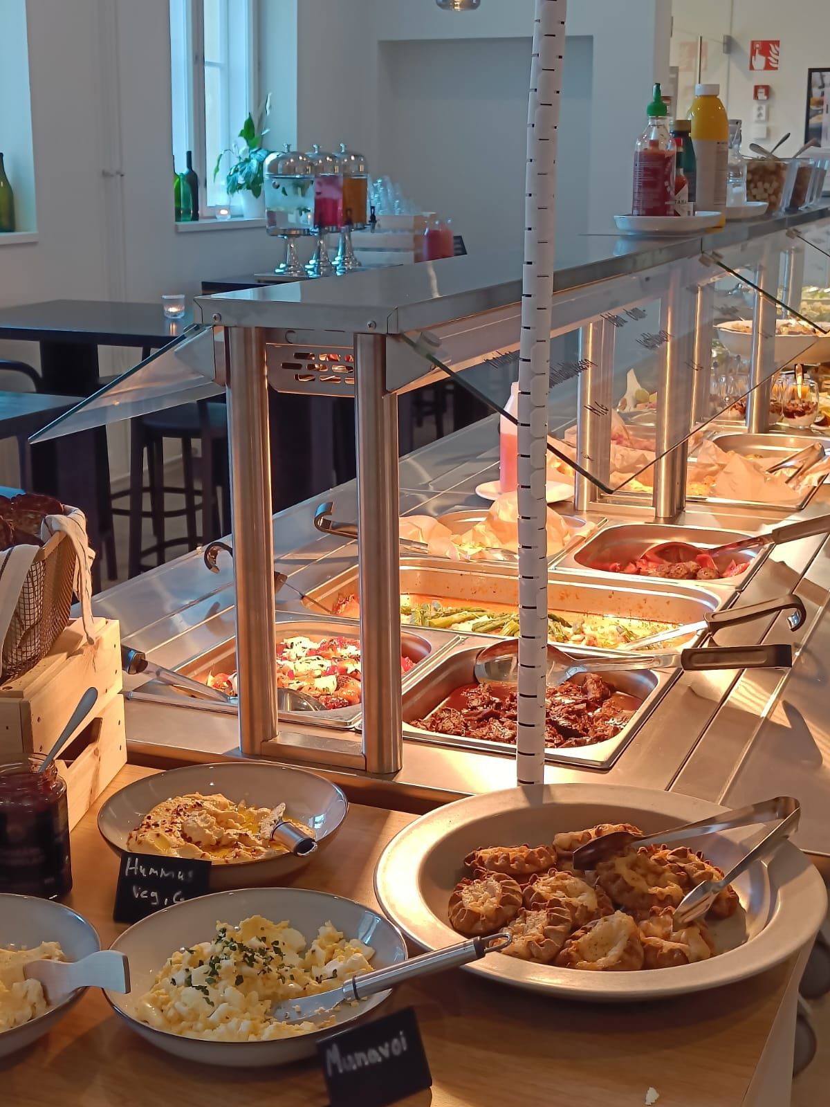 Lämpimässä pöydässä tarjoillaan brunssiklassikoita kuten munakasta, nakkeja, paistettuja perunoita ja kasvisvaihtoehtoja.