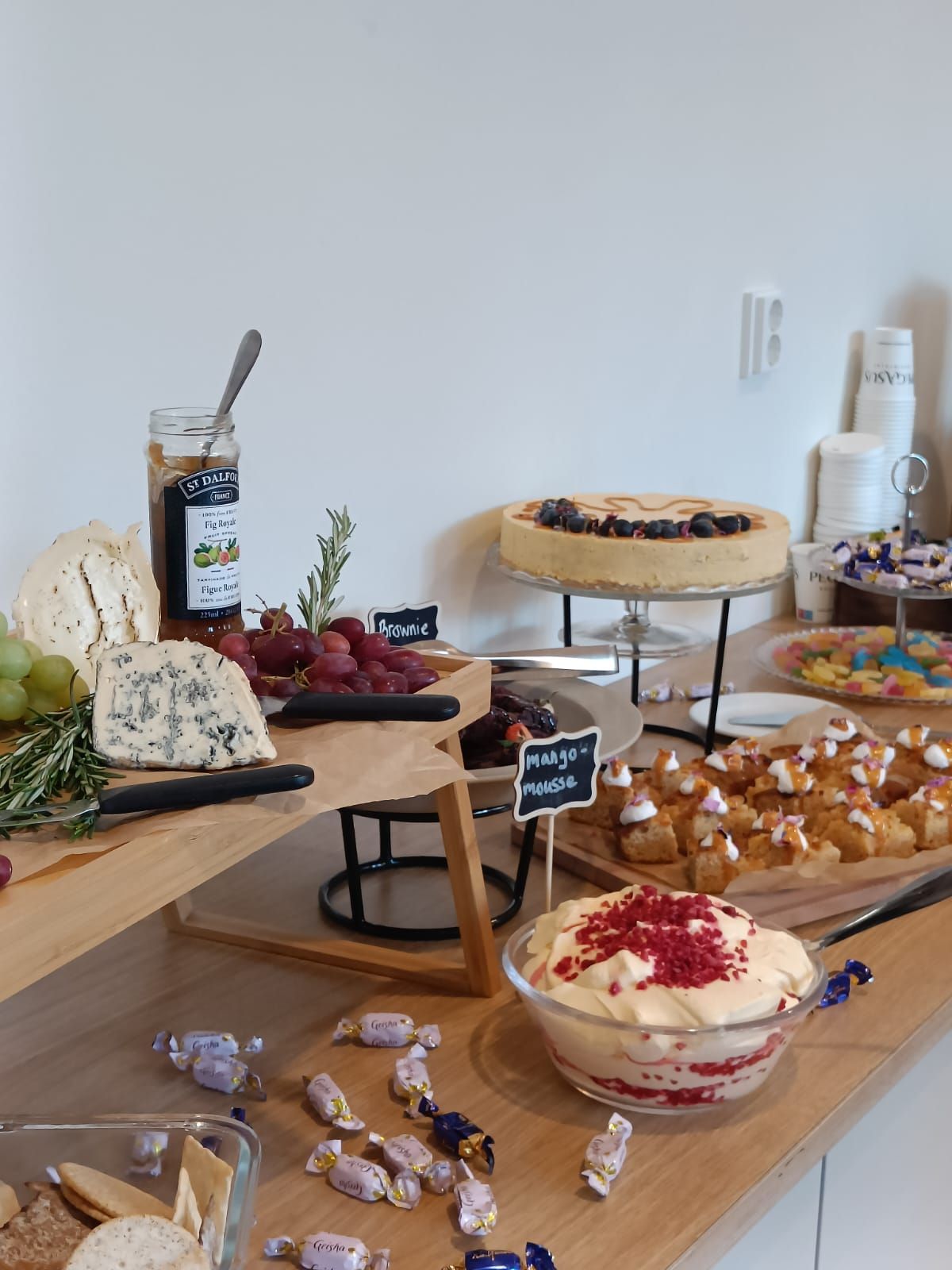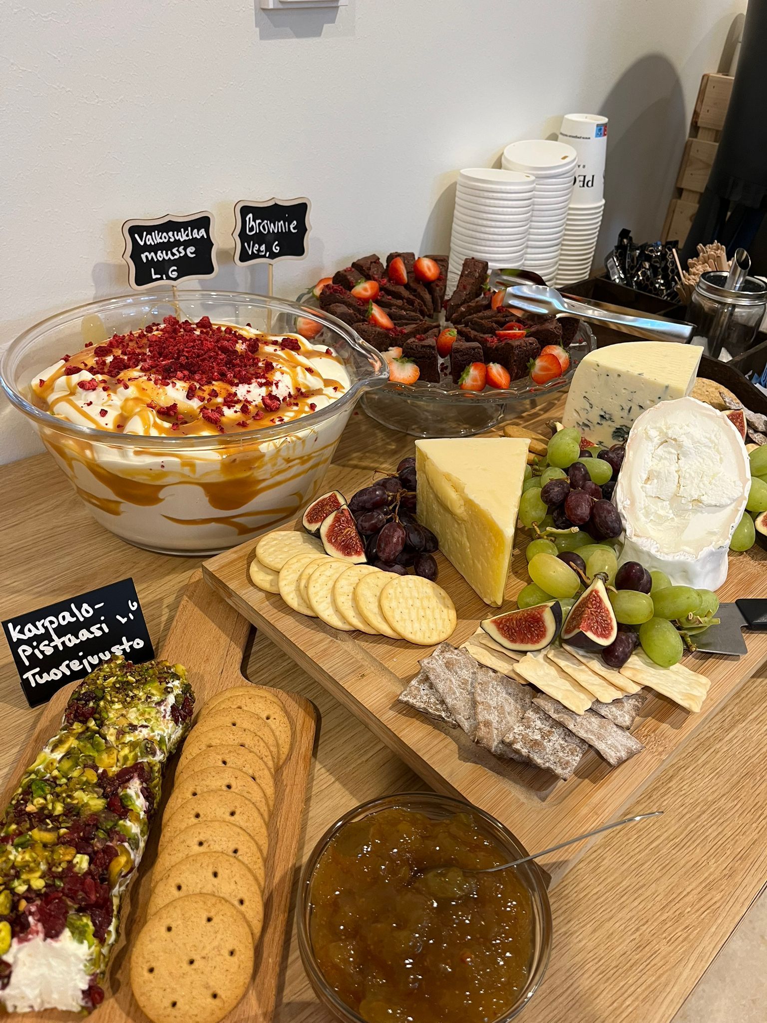 Makean ystäville laaja valikoima vaihtuvia talon herkkuja kuten juustokakkuja, rahkoja, smoothieita, juustoja, hedelmiä, suklaabrownieta