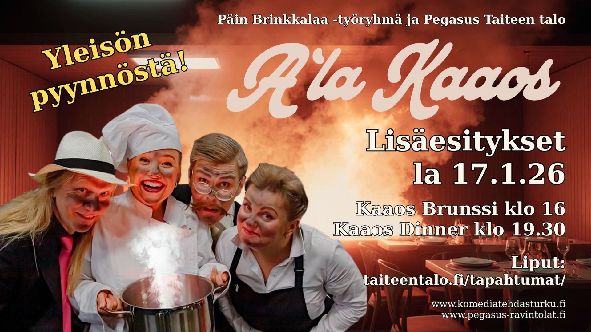 Meillä on ilo ilmoittaa, että suosittu A la kaaos -tapahtuma saa lisäesityksiä tammikuussa. Älä jää paitsi upeasta brunssista tai Kaaos dinneristä! Tule nauttimaan herkkuja 17. tammikuuta ja koe ainutlaatuinen makuelämys yhdessä taiteen ja tunnelman kanssa.