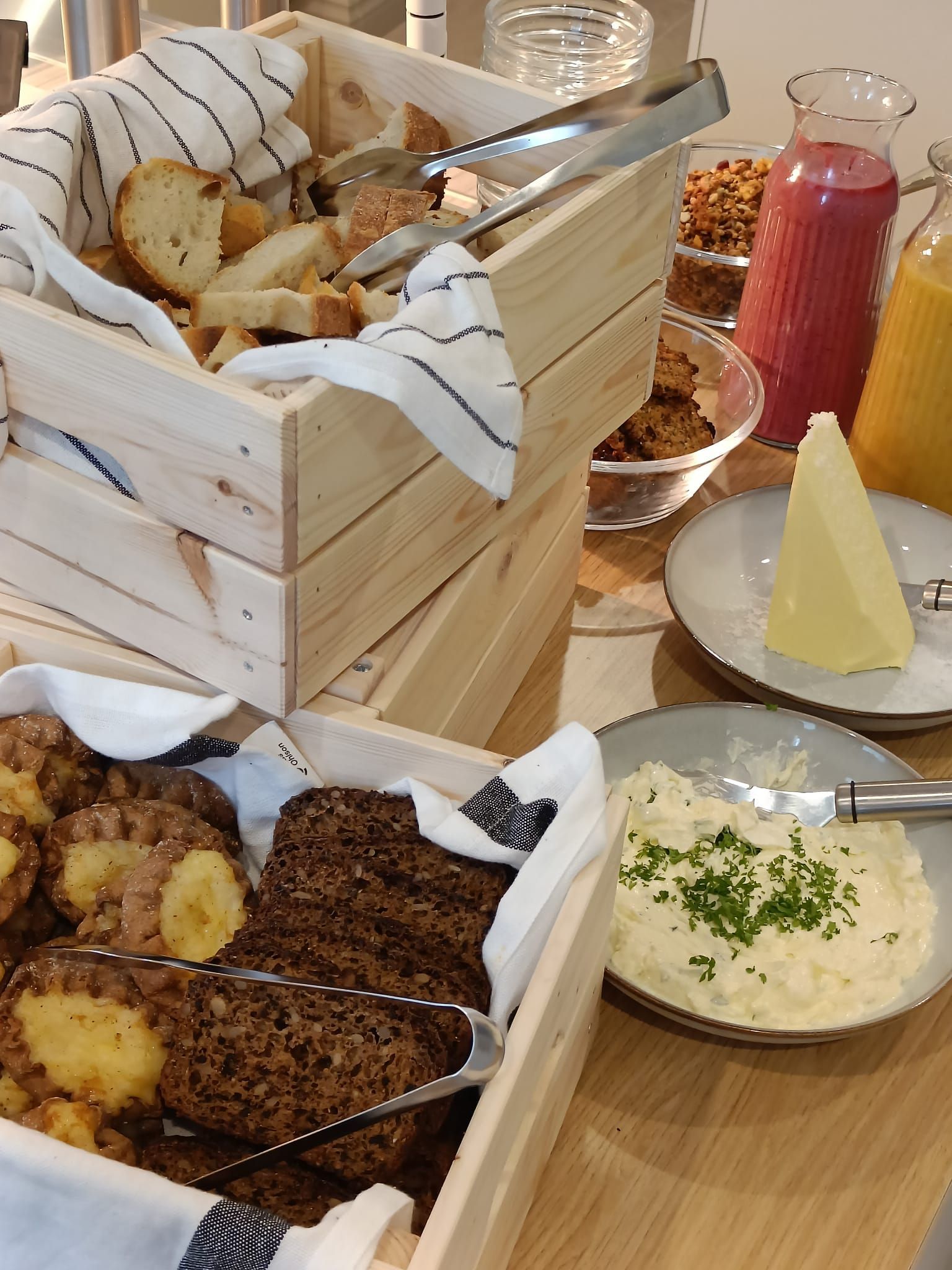 leipälajitelma, levitteet, ruokajuomat sekä kahvi/tee.